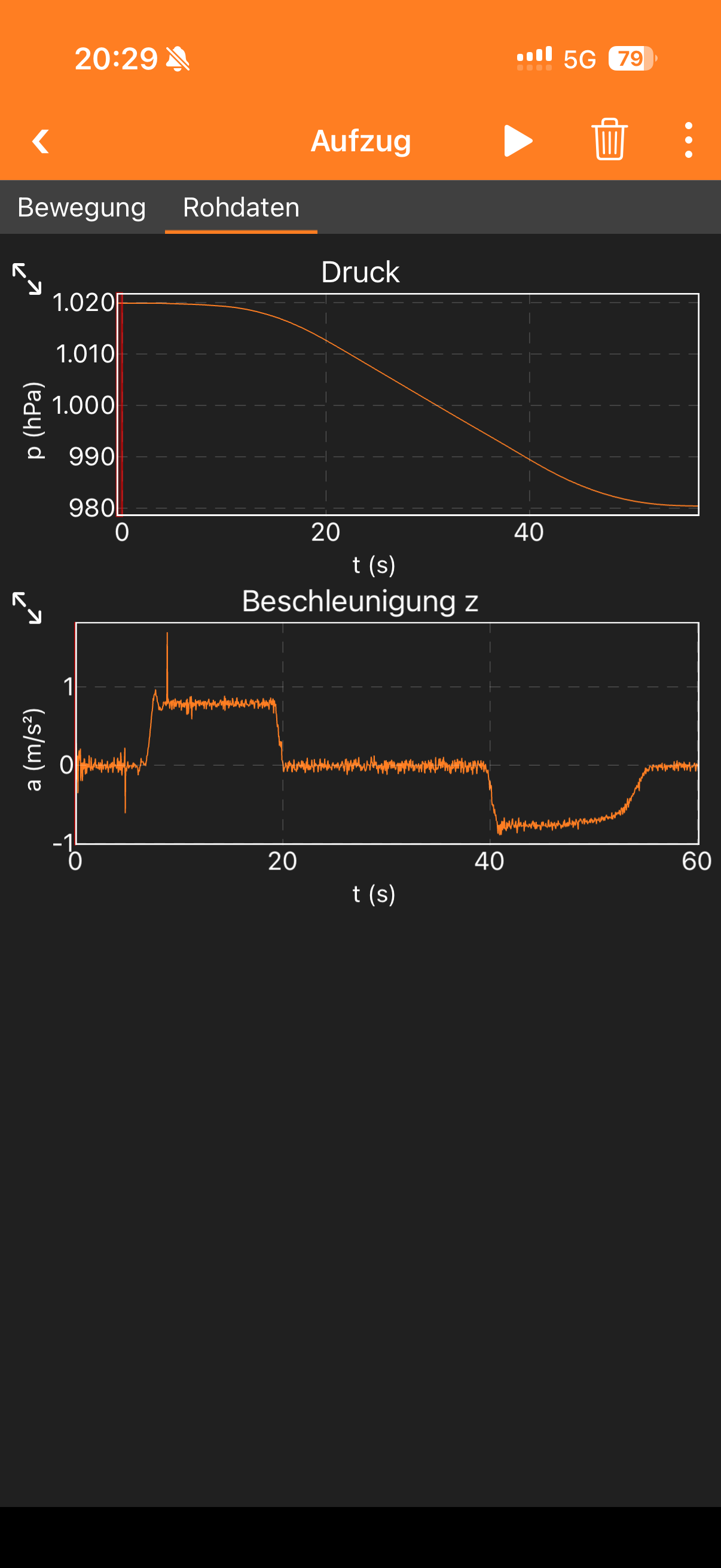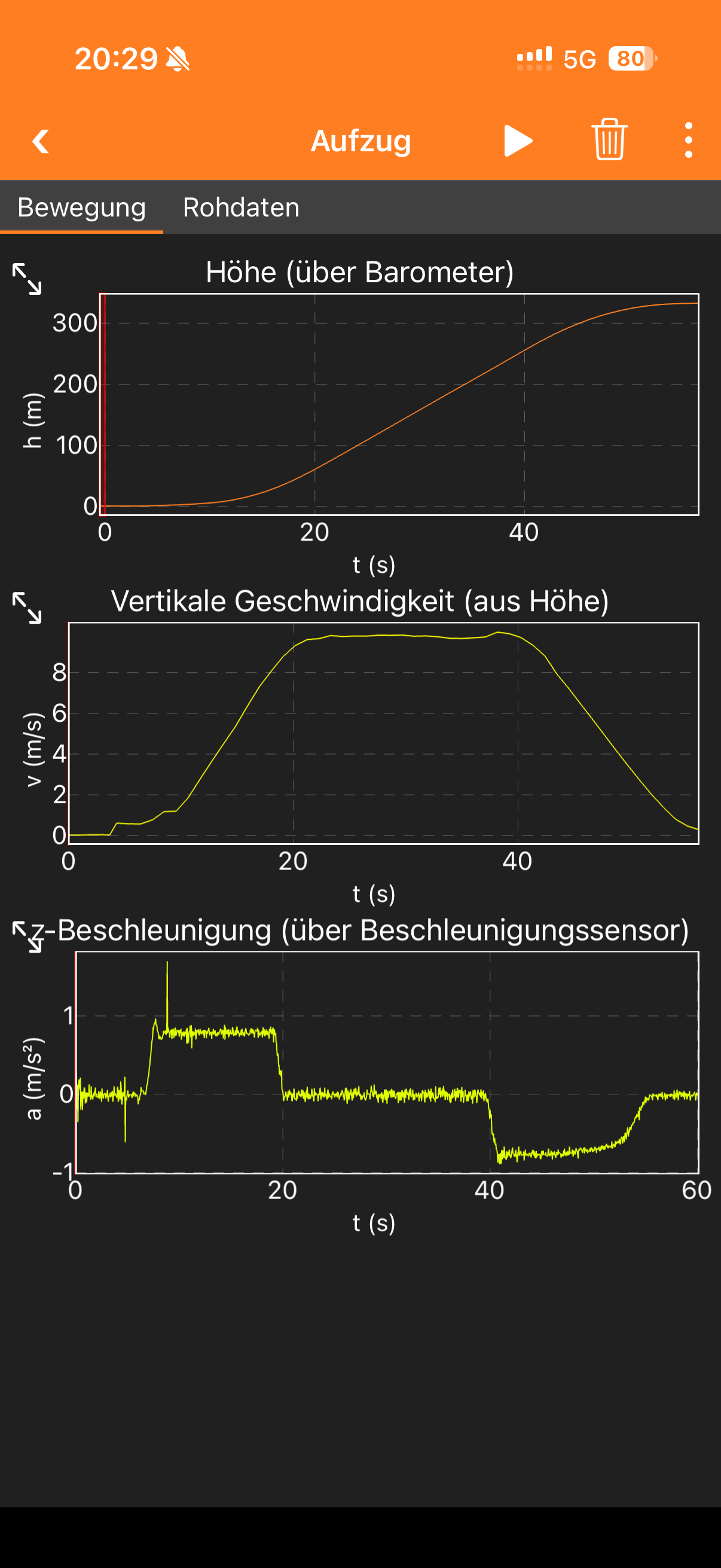 Für den Kinematik-Unterricht bietet sich die Analyse von Aufzugfahrten mit der App phyphox an, die aus der Veränderung des Luftdrucks Ort, Geschwindigkeit und Beschleunigung ermittelt. Hier stelle ich die Messwerte einer besonders langen und schnellen Fahrt zur Verfügung: Aufzugfahrt im SkyTree in Tokio auf die untere Aussichtsplattform auf 350 m Höhe. Außerdem noch die Daten der kürzeren Fahrt zur 100 m höher gelegenen oberen Aussichtsplattform: